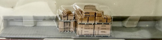 This plastic gondola load includes a stack of different sized palletized boxes on a 'floor' ready to place in a boxcar.