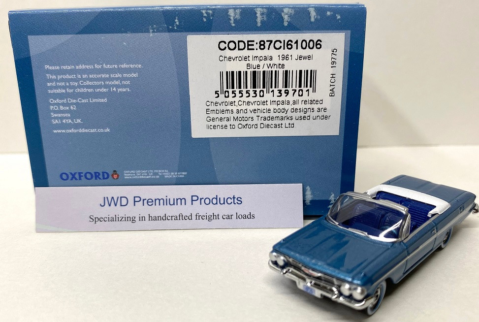 Click the button below to add the Oxford Diecast #87CI61006 Chevy Impala '61 Convertible - Jewel Blue/White (HO) to your wish list.